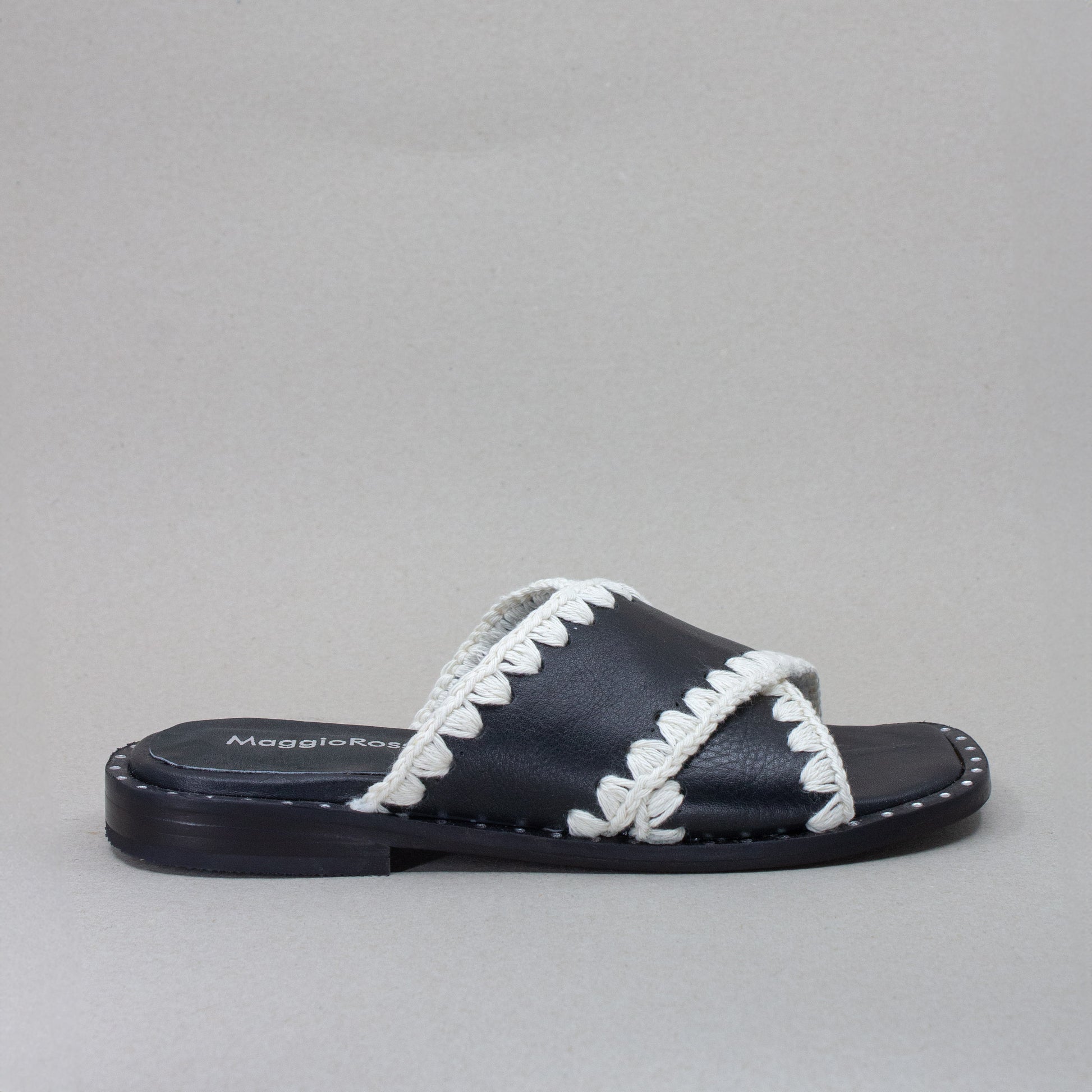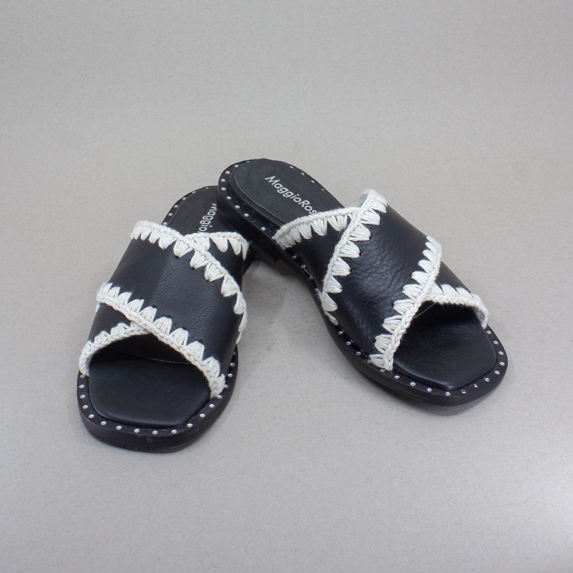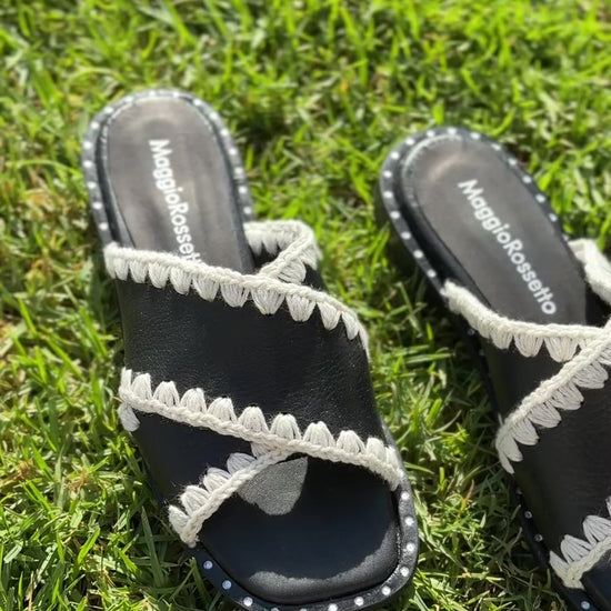 Sandalias de cuero negro con tejido artesanal.