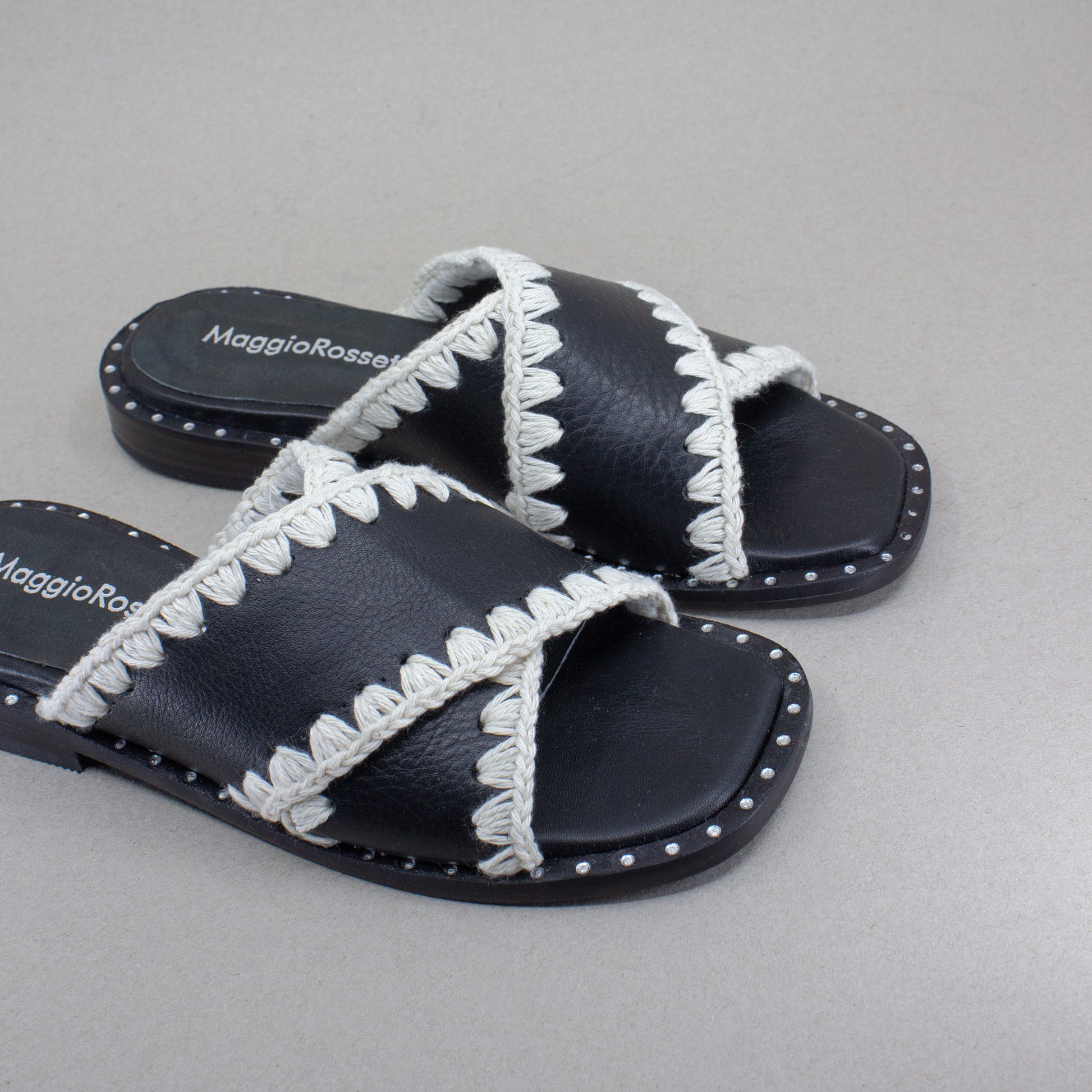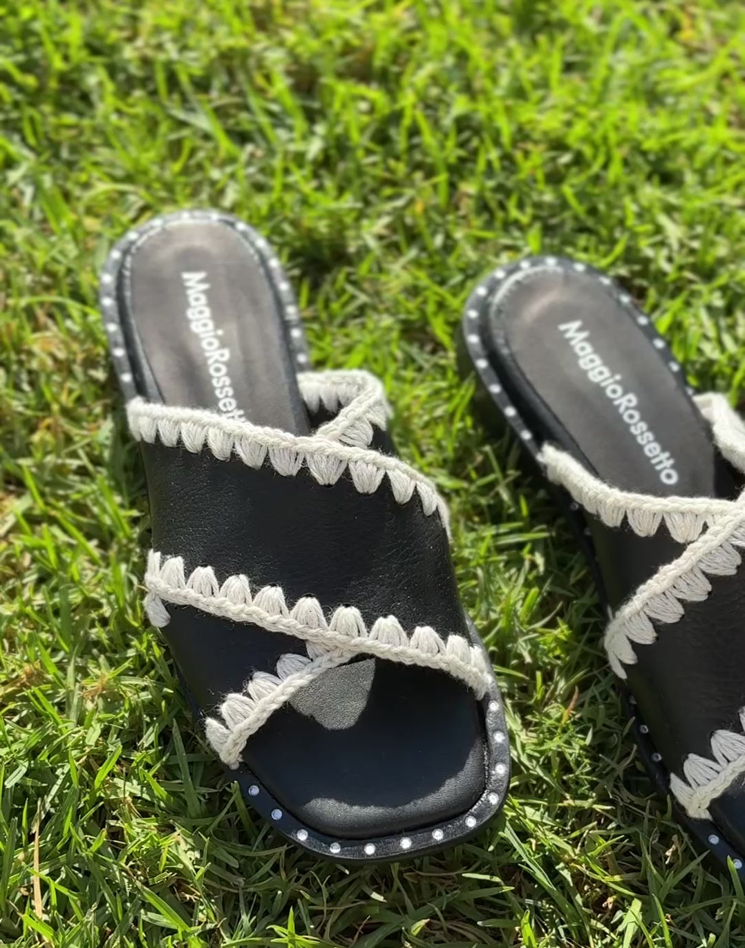Forradas en cuero y terminadas a mano con detalle tejido artesanal en hilo crudo.
