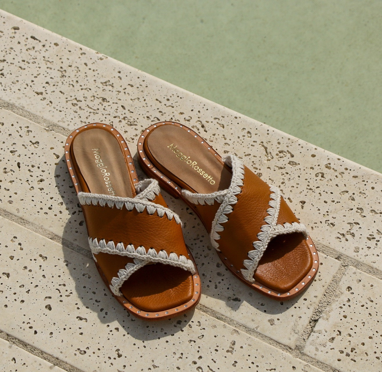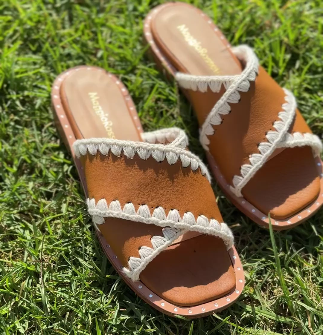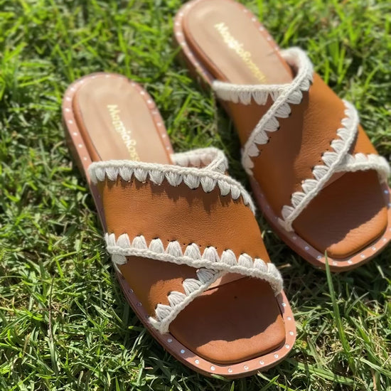 Forradas en cuero y terminadas a mano con detalle tejido artesanal en hilo crudo.